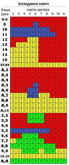 Стратегия блэкджек свитч наиболее сложная среди блэкджек-игр, так как она состоит из двух частей – стратегия сплита и игры после сплита. Причём количество возможных комбинаций для обмена достаточно велико, что делает стратегию несколько громоздкой. Оптимальная стратегия обмена состоит из довольно большой таблицы, требующей сравнения матожидания рук с и без обмена карт, что не очень удобно. Но при желании вы можете найти эту таблицу или же онлайн калькулятор оптимальной стратегии. Здесь же вам будет предложена упрощённая стратегия обмена, которая ухудшает матожидание игры на 0,17% по сравнению с оптимальной.